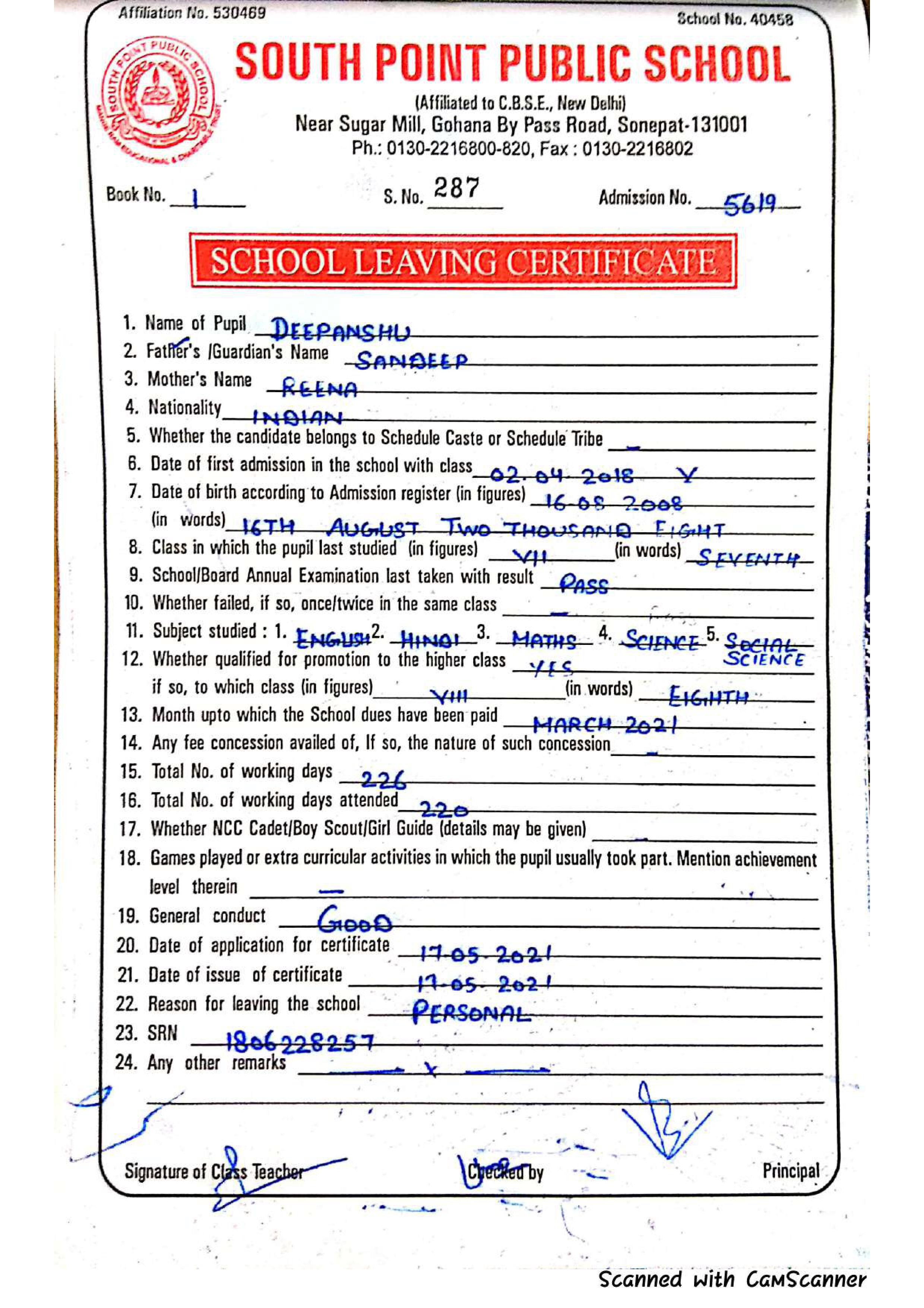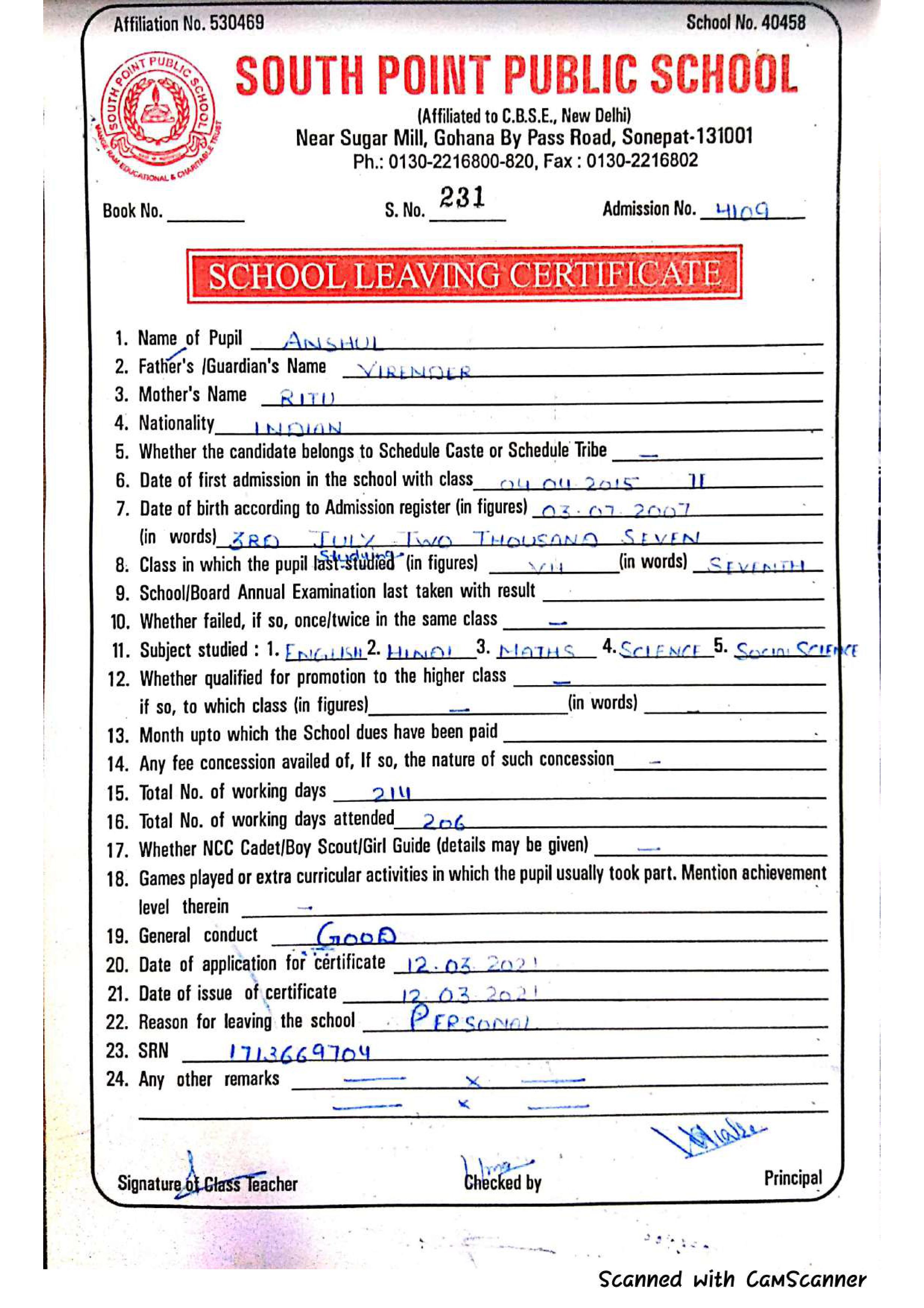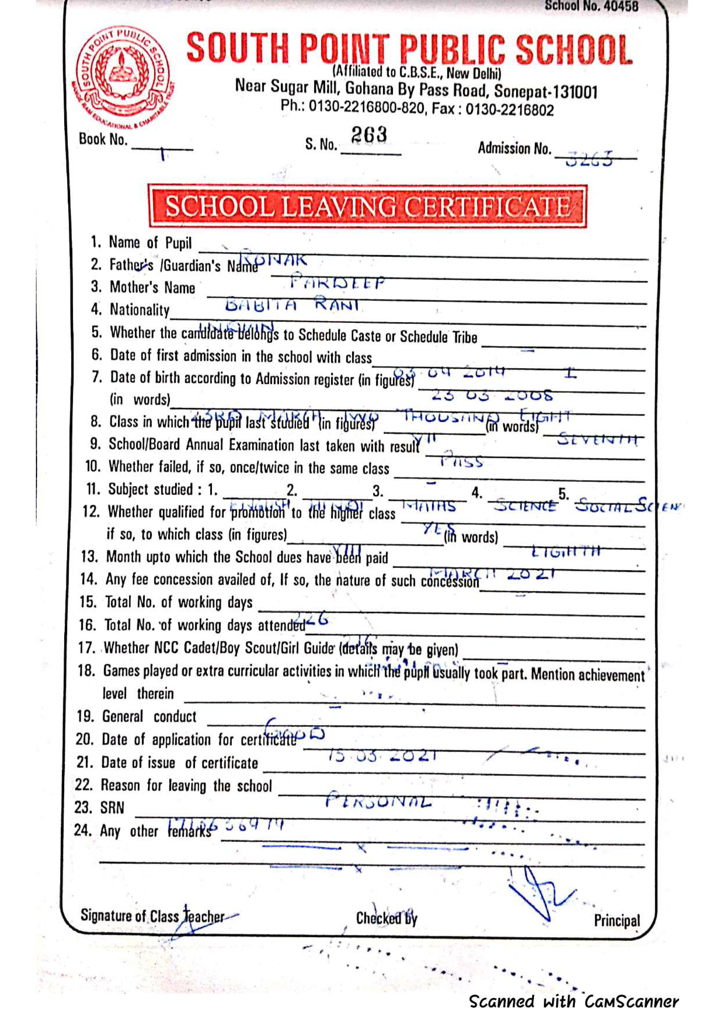 School Leaving Certificate (SLC) Class VII